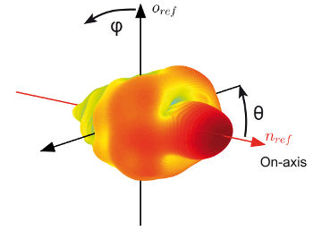 POL模块可在自由场条件下以极坐标φ、θ和r全自动测量球形表面上的声压。测量距离r应当大于设备的最大尺寸d(r>>d)和最长的波长(r>>λ),以测量远场的方向性。