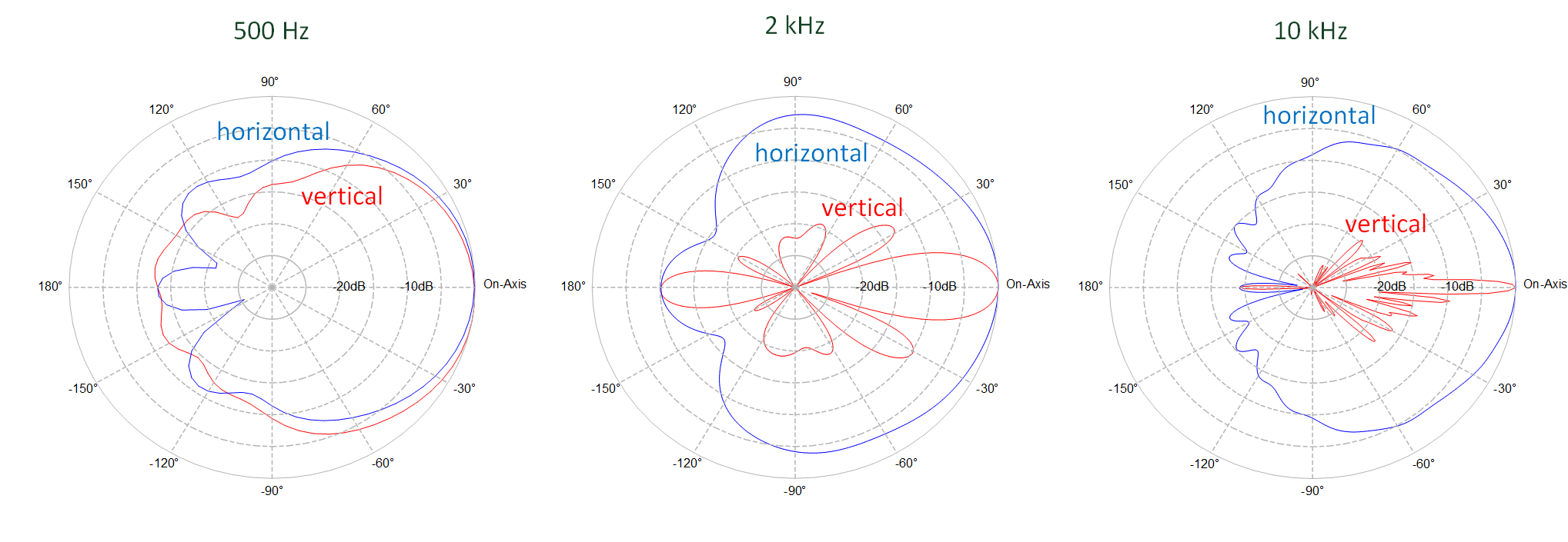 极坐标图显示了三个频率处的水平和垂直SPL