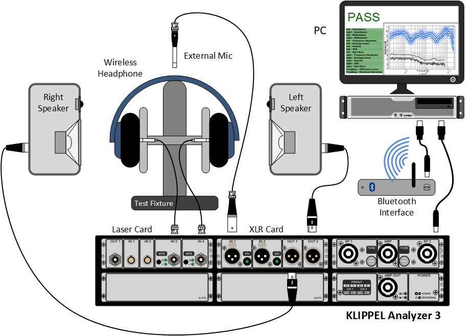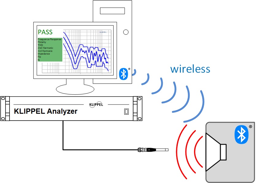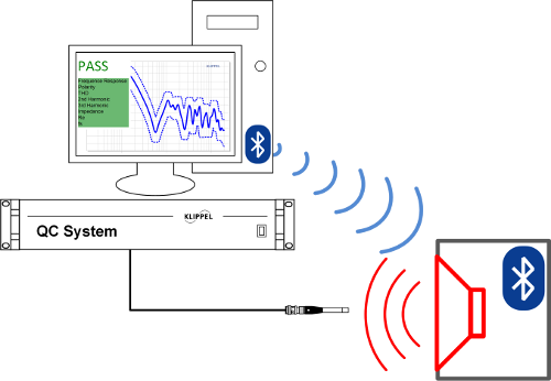 此设置类似于上面的USB音箱示例, 但是测试信号通过蓝牙无线传输, 可以使用Windows蓝牙适配器或提供专用音频的独立Dongle(如MegaSig U980蓝牙接口)来完成。自动配对、配置文件和音量控制可以由外部设备(EXD)的蓝牙音频预设功能进行。